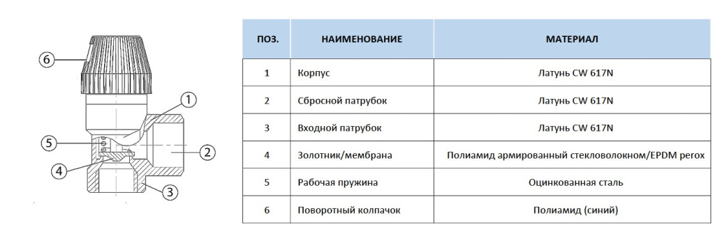 Корпус, входной и сбросной патрубки — латунь CW 617N; мембрана — полиамид/EPDM; пружина — оцинкованная сталь; колпачок — полиамид.